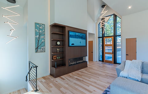On the south wall of the living room/kitchen area, there is an open corner gas fireplace with a wood panel surround and an art TV mounted above. Both the deep brown material and the vertical lines of the surround mirror the kitchen cabinets on the north wall adding warmth to the space and welcoming visitors as they enter.